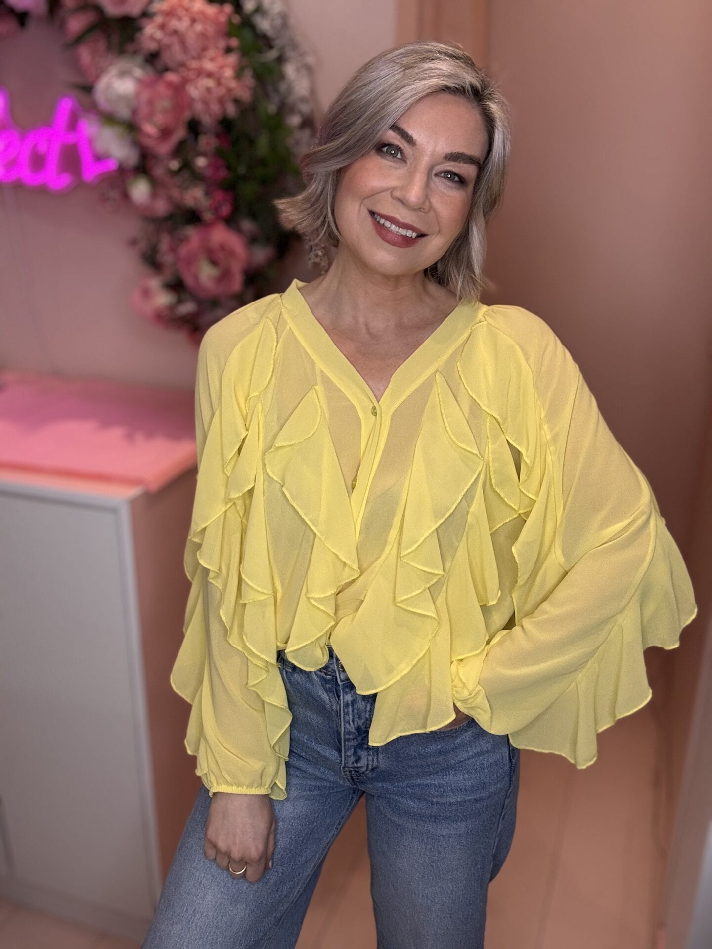 Silk feel fabric makes this beautiful blouse. Stunning sheer lace with frill trim detail.